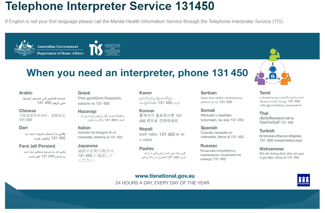 We understand that communication is key to good healthcare, which is why we offer translation services, including the Translating and Interpreter Service (TIS), National Relay Service (NRS, and National Auslan Interoreter Booking Service (NABS). If you require additional communication support, please let our reception team know at least 48 hours before you appointment.